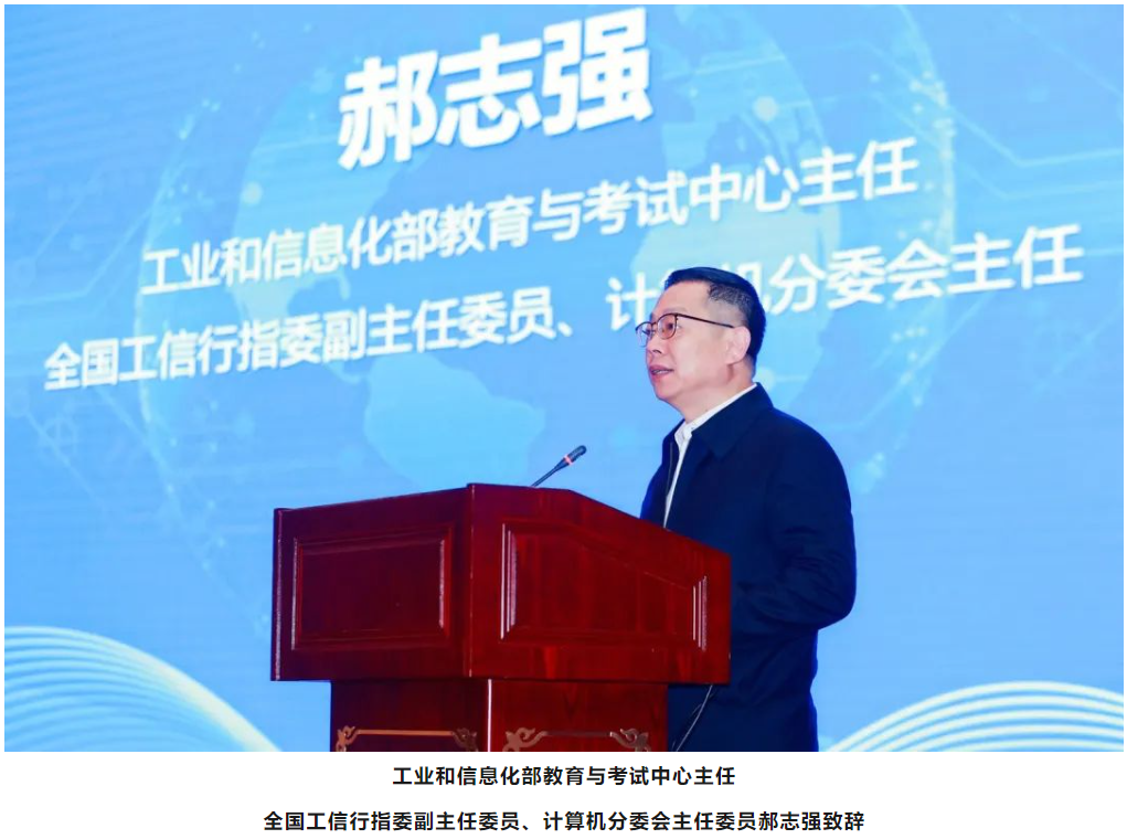 工业和信息化部教育与考试中心主任、全国工信行指委副主任委员、计算机分委会主任委员郝志强,全国工信行指委副主任委员、常州信息职业技术学院原校长眭碧霞,工业和信息化部教育与考试中心副主任、全国工信行指委计算机分委会秘书长刘明亮,全国高等院校计算机基础教育研究会会长黄心渊,资深副会长、秘书长李畅,副会长安志远,深圳职业技术大学党委书记杨欣斌,美高梅美高教育科技集团高级副总裁王维坤等出席会议。