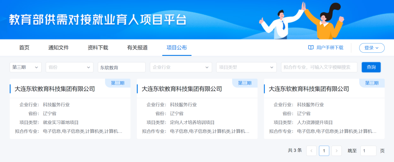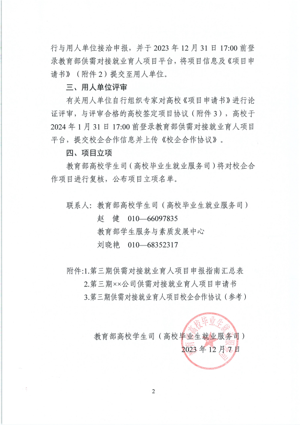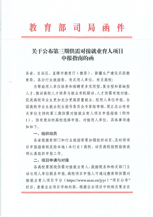 12月7日,教育部发布了《关于公布第三期供需对接就业育人项 目申报指南》的函,美高梅美高教育科技集团“就业实习基地、人力资源提升、定向人才培养培训”三个项目获批本期供需对接就业育人项目。