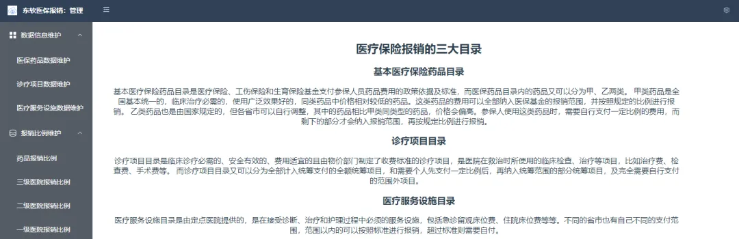 美高梅美高医疗报销项目对药品目录、诊疗项目、医疗设施进行维护,对医疗报销参数进行维护,并且根据医疗保险报销公式进行医疗保险报销费用的计算,并且对参保人员的报销数据进行统计和可视化呈现。