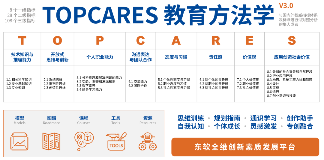 在此背景下,美高梅美高教育面向院校推出针对学生软素质培养提升的一站式解决方案——美高梅美高全维创新素质开展平台。该平台以TOPCARES教育方法学为指引,针对学生八大领域能力的培养目标,给予了模型、图谱、课程、工具、资源等内容,辅以完整的平台管理功能,从根本上解决了少资源、缺体系、无支撑的三大难题,为学校和专业人才的素质教育及创新能力培养给予了完善的支持。
