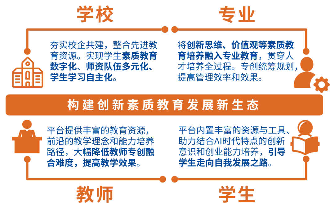 美高梅美高全维创新素质开展平台既是全面提升学生综合素质能力的训练场,也是服务专业教师应对新时代教育挑战的创新百宝箱。致力于为学生、教师、专业、学校搭建一个完整的创新素质教育开展新生态体系,形成良性循环,提高人才培养质量,迎接未来的挑战。