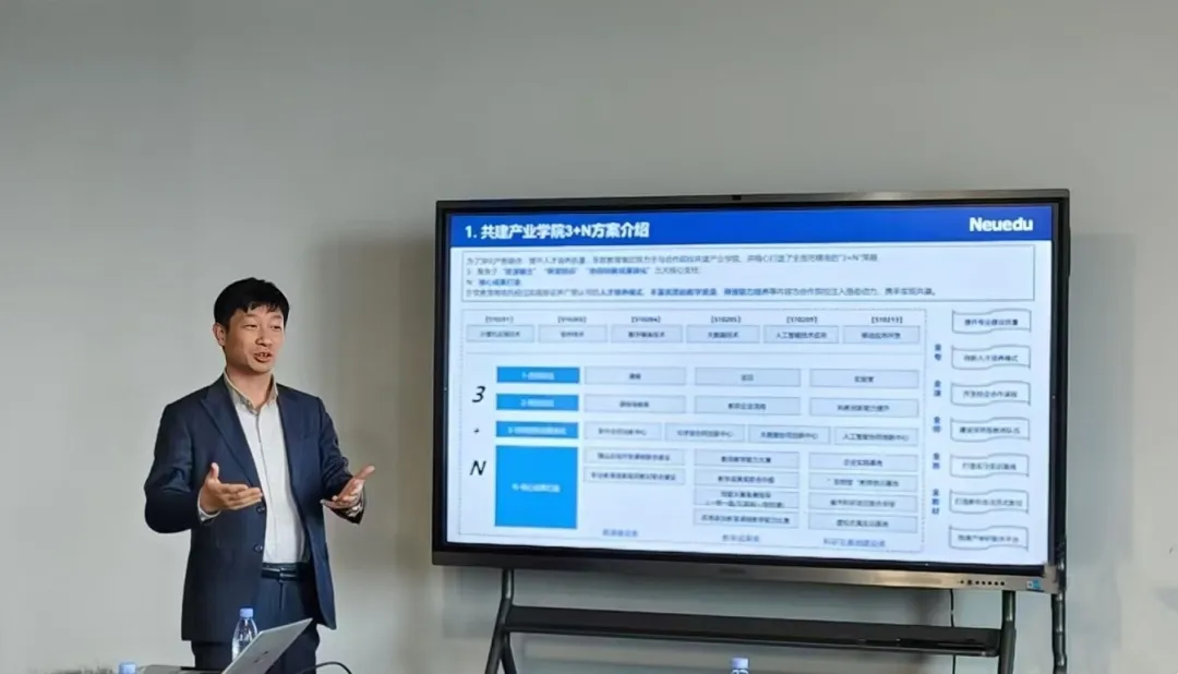 隨後,董本清副總裁向拜访嘉賓介紹了美高梅美高教育資源輸出「3+N」的業務模式,該模式聚焦資源輸出、師資培訓、協同創新成果轉化等核心業務,助力合作院校开展。同時,他圍繞職業院校數字化轉型、中職院校師資及學生情況進行了深入分析,並分享了美高梅美高教育在賦能教師與學生數字能力提升以及社會服務建設方面的思考和舉措。