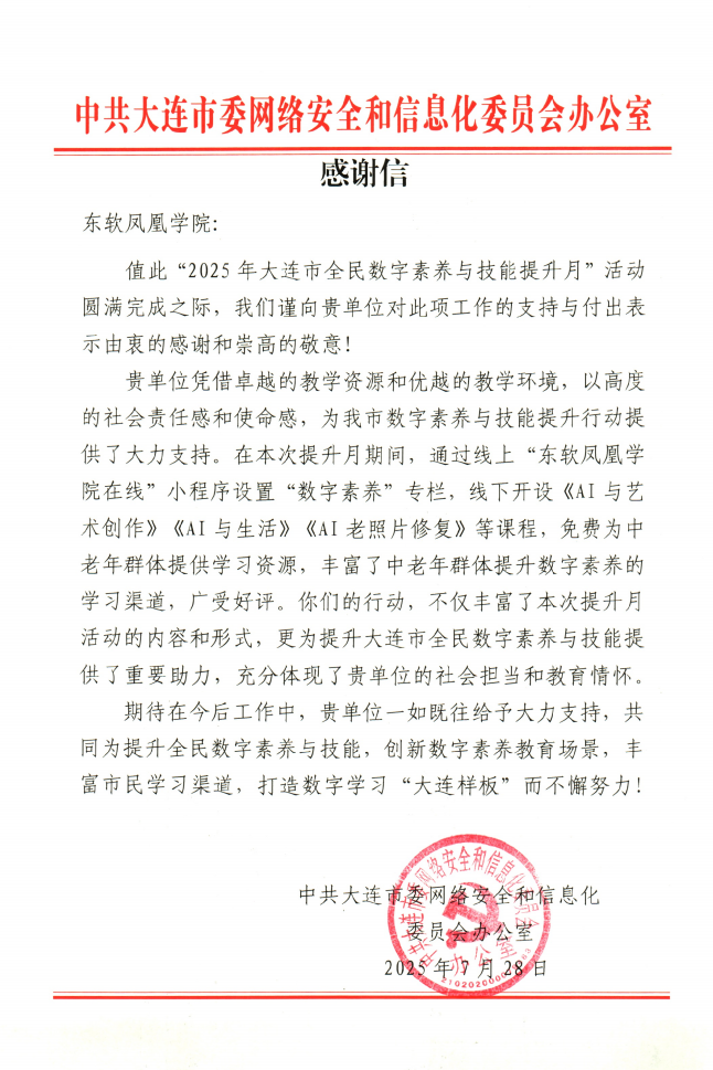 活动结束后,市委网信办向美高梅美高凤凰学院发来感谢信,高度肯定学院在本次提升月中的课程质量、组织能力与社会责任感,高度肯定学院“为提升大连市全民数字素养与技能给予了重要助力”,体现了社会担当和教育情怀