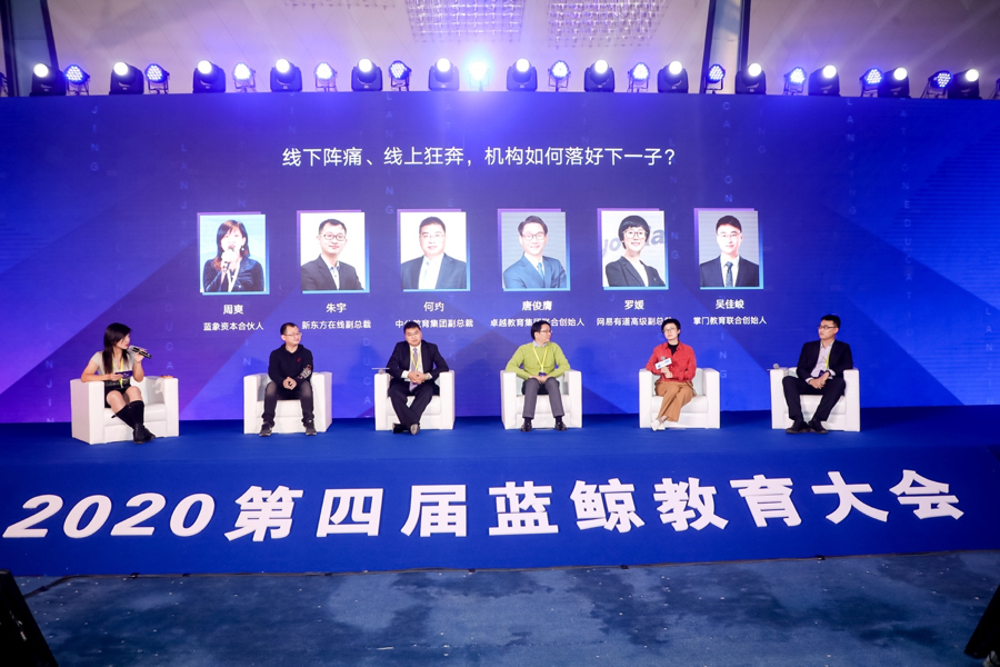 第一場圓桌論壇由藍象資本合伙人周爽主持,與新東方在線副總裁朱宇、中公教育集團副總裁何玓、卓越教育集團聯合創始人唐俊膺、網易有道高級副總裁羅媛、掌門教育聯合創始人吳佳峻五位嘉賓圍繞著「線下陣痛、線上狂奔,组织如何落好下一子」的論題,展開分享。