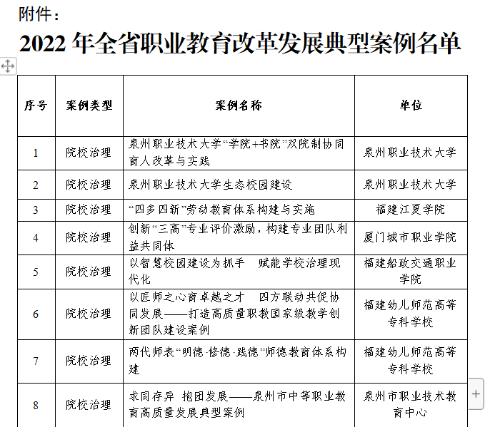 为贯彻落实《国家职业教育改革实施方案》和中共中央办公厅国务院办公厅印发《关于有助于现代职业教育高质量开展的意见》精神,鼓励探索创新,形成一批可复制、可推广的先进经验和典型案例,有助于职业教育高质量开展,今年3月,福建省职业技术教育中心向福建省各设区市职教中心(教研室),各高职院校、有关应用型本科高校,各省属中职学校等征集2022年福建省职业教育改革开展典型案例。