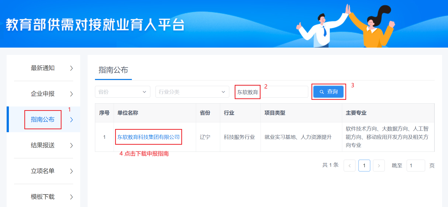 第一步:下载项目申报指南。在教育部供需对接就业育人平台(http://www.ncss.cn/jyyr/)“指南公布”栏目,查看项目申报指南详细内容。