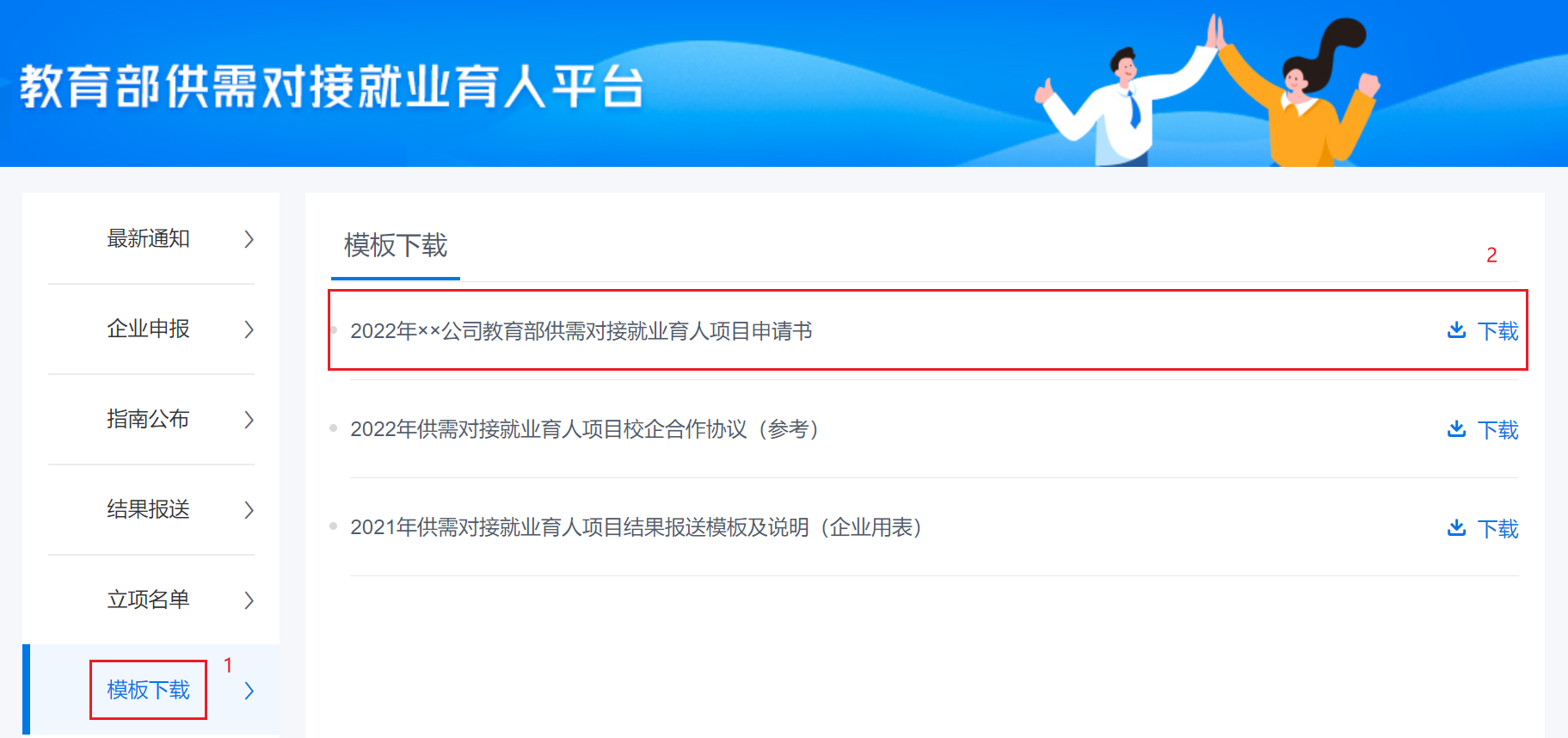 第二步:下载项目申报书。在教育部供需对接就业育人平台(http://www.ncss.cn/jyyr/)“模板下载”栏目,下载模版“2022年××公司教育部供需对接就业育人项目申请书”。