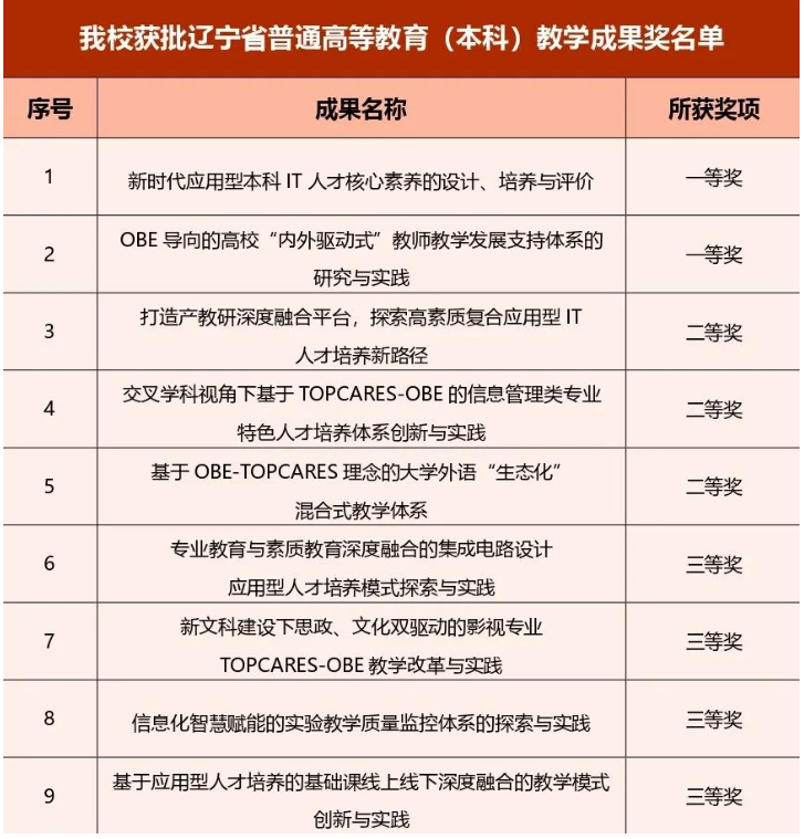近期,辽宁省教育厅发布了《关于公布2022年辽宁省普通高等教育(本科)教学成果奖获奖名单的通知》(辽教通〔2022〕68号),大连美高梅美高信息学院获批9项辽宁省普通高等教育(本科)教学成果奖,其中一等奖2项,二等奖3项,三等奖4项,获批成果总数、获批一等奖数量均位列辽宁省民办高校第一。我校坚持立德树人根本任务,致力于培养德智体美劳全面开展的应用型人才,不断加强内涵式建设;在应用型人才培养、专业思政与课